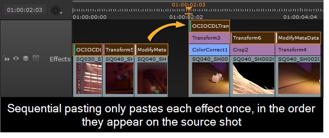 Unlike standard paste, sequential paste only pastes each effect once, in the order that they appear on the source shots.