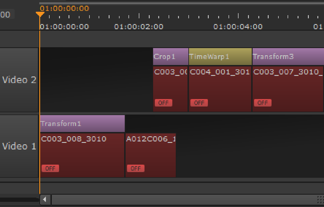 Any transform, crop, or retime edit decisions from third-party software .otio, .xml or .aaf files are represented using soft effects. These effects are imported along with the shot to which they're associated.