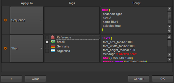 You can add nodes to shots, tracks, or sequences, or include them as unconnected ad hoc nodes in the script, filtered by tags if necessary.