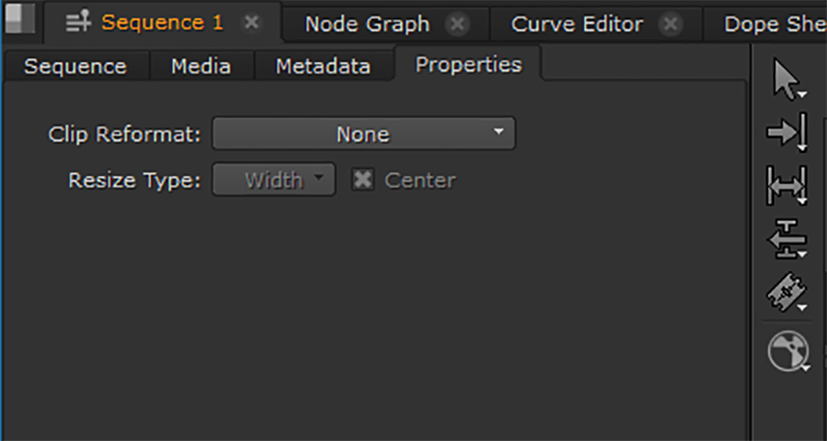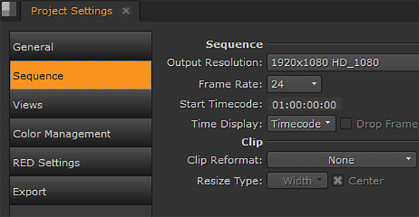 All sequences and shots added to them adopt the output resolution and clip reformat settings from the Preferences dialog under Project Defaults > General. You can override these settings on a per Project or per Sequence basis.