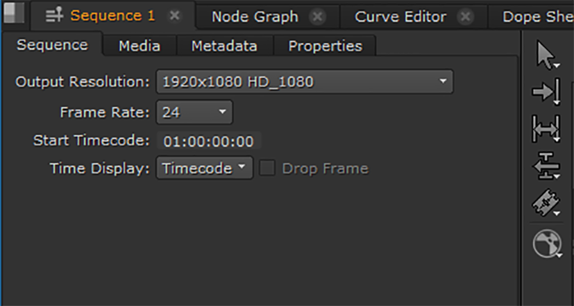 The current sequence format is controlled by the Output Resolution dropdown in the timeline Sequence tab. The selected resolution is applied to all shots on the timeline, but by default, shots retain their native resolution. For example, setting the Output Resolution to 2k_DCP on a timeline containing HD_1080 shots results in the output resolution being larger than the shot.