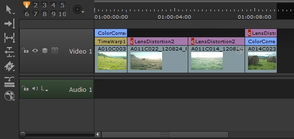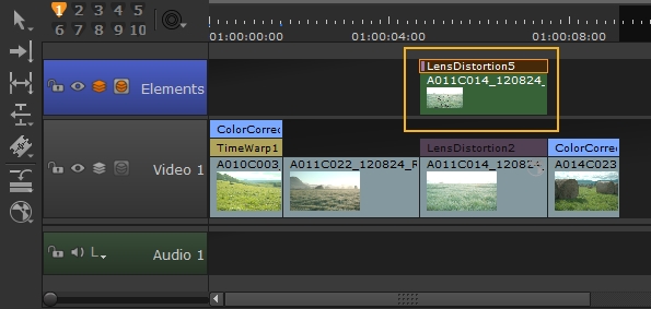 1. Copy the LensDistortion effect from the Video 1 track and paste it on to the CG shot on the Elements track.