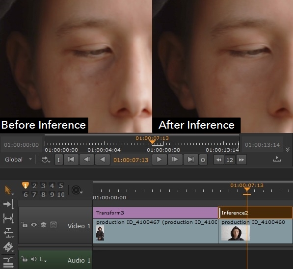 So you've trained your model and it's ready to go. In this example, we've trained a model to remove a bruise from an actor's face. Here's how to apply the model to a shot on the timeline.