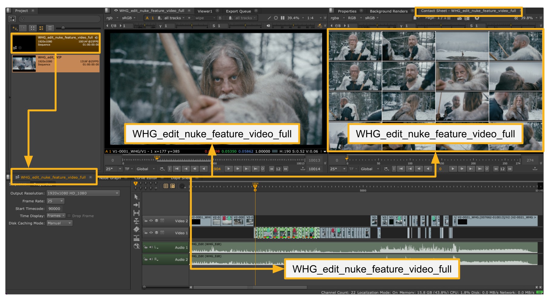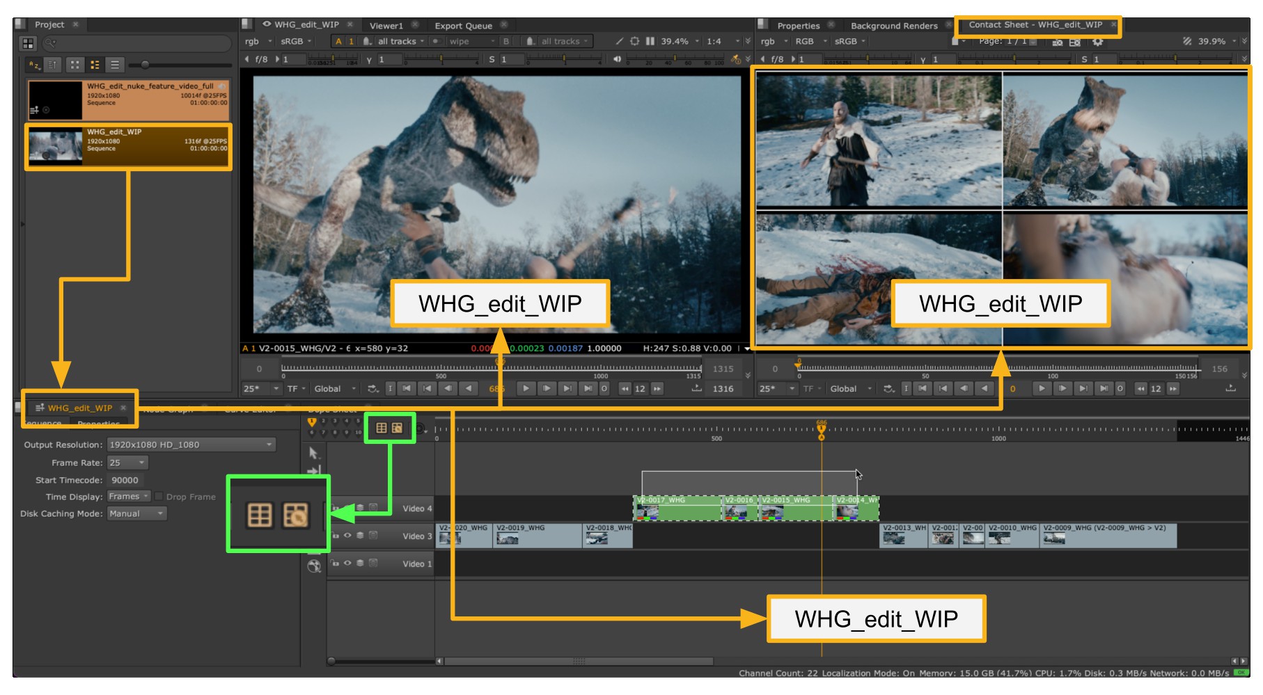 To do this, simply open a sequence and create a Contact Sheet Viewer populated with some clips. In this example note there is a sequence loaded called “WHG_edit_nuke_feature_video_full”.