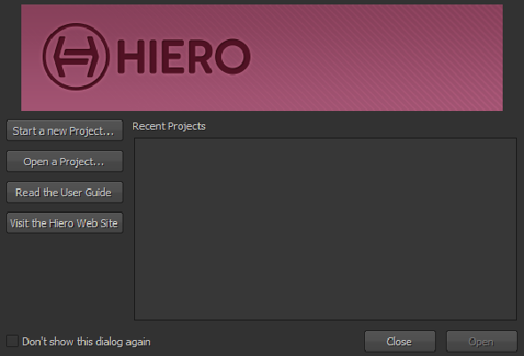 The startup dialog allows you to create a new project, open an existing project, or view the User Guide and website dedicated to Hiero.