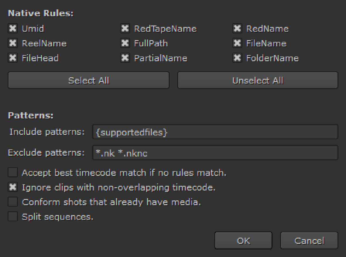 • Patterns - sets the inclusion and exclusion parameters during the conform, separated by spaces. For example, *mov *dpx would only include or exclude .mov and .dpx files.