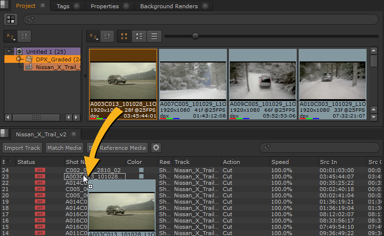 If you want to conform a single entry in the spreadsheet, drag-and-drop the media from the bin view onto the required entry in the spreadsheet.