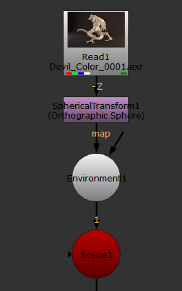 環境光を使用するには、最初に実際の環境をHDR画像として撮影する必要があります。次に、SphericalTransformノードを使用して、この画像を球面マッピング画像に変換します。球体は3Dオブジェクトを囲むために使用され、マップされた画像の色がそれらを照らします。