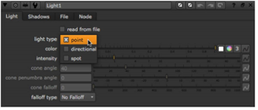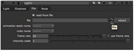| 2. | ライトコントロールで、チェックread from file。これにより、 Fileタブでは、からのライトを読み取ることができます.fbxファイル。また、値が入力されるすべてのコントロールを無効にします.fbxファイル。これらの値を表示して式で使用することはできますが、変更することはできません。 .fbxファイル。で行う変更.fbxファイルは、Lightノードのこれらの値に反映されます。 |