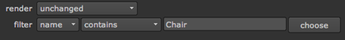 これは、オブジェクト名に何らかの構造がある場合に役立ちます。たとえば、/ Root / Chair / Seat、/ Root / Chair / Back、/ Root / Tableなどのオブジェクトがある場合は、選択できますcontainsフィルター名フィールドをChairテーブルをそのままにして、椅子のすべての部分に素材を適用します。