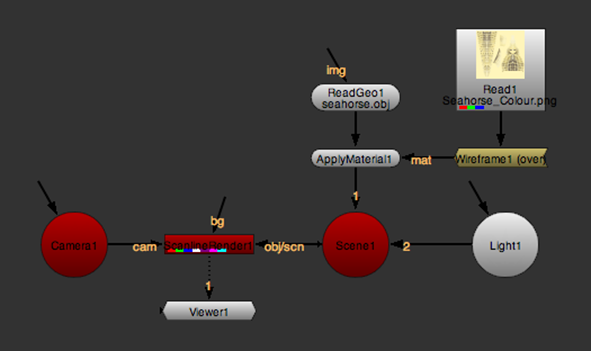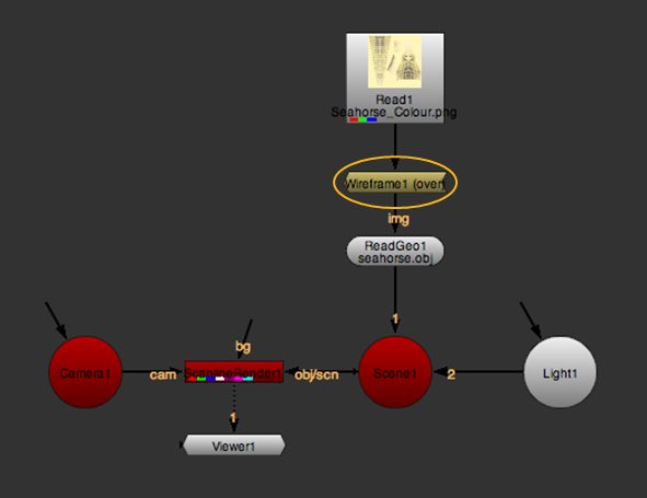 | 2. | Wireframeノードを2Dテクスチャイメージと3Dオブジェクトノードの間に配置するか、ApplyMaterialノードのmat入力。 |