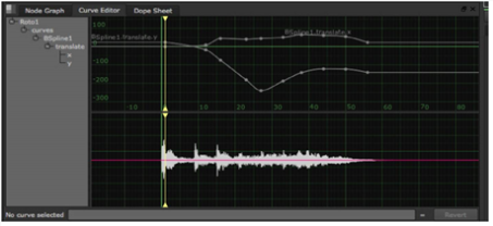 オーディオファイルを読み込んだら(を参照ノードグラフへのオーディオファイルの読み込み)、オーディオクリップのオーディオ波形を表示し、カーブエディターまたはドープシートでアニメーションカーブにアクセスできます。