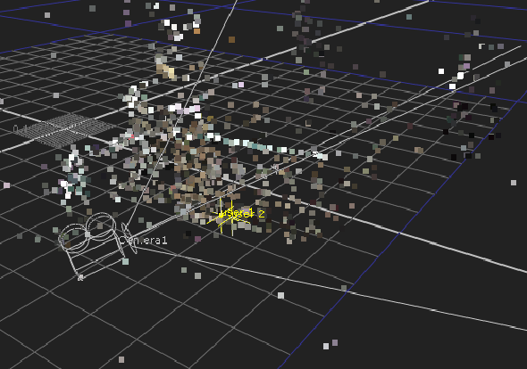 使用される測定単位はユーザー次第です。 Nuke任意の値を3D空間の1ユニットに等しいと見なします。この画像は、2つのユーザートラックがマークされたポイントクラウドとカメラを示しています。青い四角は1つの測定単位を表すため、小さな四角はその単位の1/10を表します。したがって、セットでメートル単位で測定した場合、1つの小さな正方形はメートル、センチメートル、またはミリメートルに等しくなります。