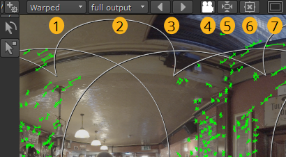 ビューアーの左上にあるツールを使用して、完全な出力または個々のビューを表示できます。各ビューは、ワープされた結果として、または緯度経度と直線のソースビューとして使用できます。
