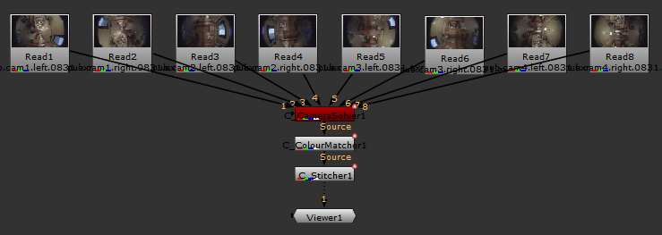 C_CameraSolverは、リグと元のソース画像に関するメタデータを、後のノードがアクセスするために下流にフィードします。最も重要なのは、C_StitcherとC_ColourMatcherです。これらのノードは両方とも、タスクを実行するためにこの情報を必要とするため、C_CameraSolverはすべてのステッチスクリプトの上部にあるエンジンツールになります。