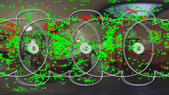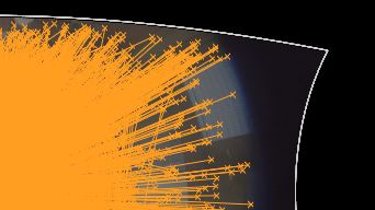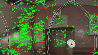 最初に、カメラで一致したすべての機能がビューアーで互いにオーバーレイします。個々の一致は、リグ上のカメラを解決するか、2番目の画像に示すようにビューアーにズームインするまで表示されません。