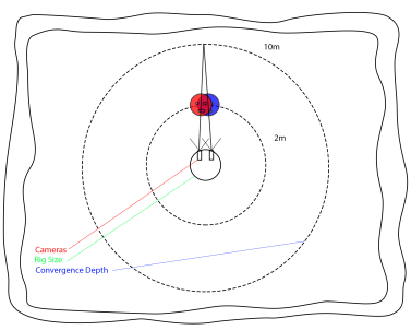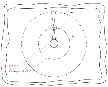 カメラが球の上にあると仮定すると、球のサイズを変更すると、カメラが収束する角度に影響します。C_StitcherはRig Size C_CameraSolverで設定Cameras球を制御するタブ。これにより、ソルブの品質に応じて、リグの3D表現が実際の単位に近くなります。のConverge次に、コントロールはステッチが収束する深さを定義し、必要な関心ポイントに焦点を合わせます。