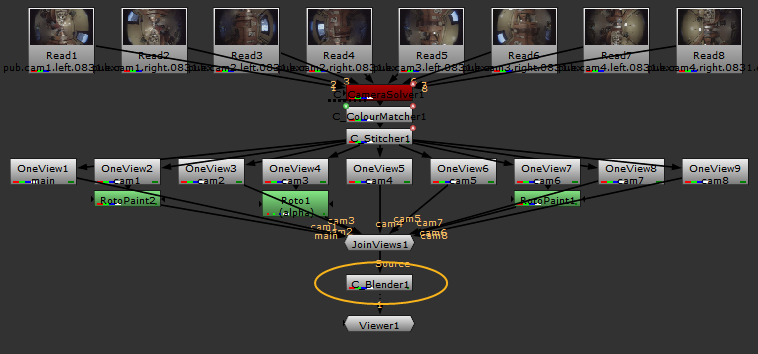 C_Blenderは、ステッチを手動で修正するときにすべての画像を結合するためのマージノードとして使用されます。C_Stitcherは個別のワープ画像を出力できます。これを手動で修正して垂直方向の位置ずれを除去し、編集して異なる画像間の継ぎ目を制御し、最終的にC_Blenderで結合します。
