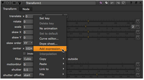 また、式リンクを作成して、チャネル、レイヤー、およびフォーマットコントロールをさまざまなノードの他のコントロールと接続することもできます。これらのコントロールはアニメーション化するためのものではないため、すべての範囲を使用することはできませんNukeまた、PythonまたはTcl言語を使用することもできません。を使用してコントロールをリンクできますLinkmenu