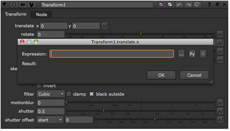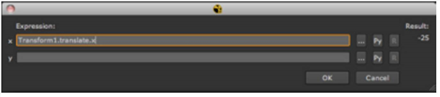 したがって、10番目のフレームでTransformノードのx変換フィールドから値を取得するリンク式を作成するには、次のように入力します= 式ダイアログを開くためのパラメーターで、入力します Transform1.translate.x(10)ダイアログのExpressionフィールド。
