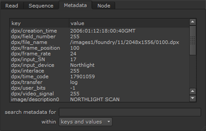 メタデータのリストをフィルタリングするには、 search metadata forフィールド。たとえば、次のように入力した場合fの中にsearch metadata forフィールドには、文字fを含むキーと値のみが表示されます。デフォルトでは、検索はキーと値の両方で行われます。検索をキーまたは値のみに制限する場合は、設定しますwithinにkeys onlyまたはvalues only。たとえば、ファイル形式を入力することにより、入力のファイル形式に固有のメタデータを表示できます(たとえば、 dpx/) の中にsearch metadata forフィールドと設定withinにkeys only。