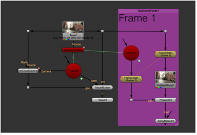 ヒント: ジオメトリを複数のフレームにテクスチャリングするには、ベイクできます Projection MergeMatノードを使用してProject3Dノードを結合する前に、複数のフレームでロトノードを使用して物事をマスクします。次に、MergeMatノードをApplyMaterialノードのmat入力とModelBuilderを名前のない入力に追加します。ビューアーをApplyMaterialの出力に接続し、結果を表示します。