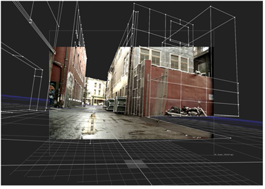 これにより、現在のテクスチャフレームに投影が作成されます。Project3Dノードは、入力画像とカメラをテクスチャフレームにロックするように設定されたFrameHoldノードを持ちます。Project3Dノードは、 mat ApplyMaterialノードの入力。