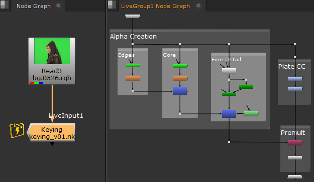 LiveGroupアイコンが黄色に変わり、LiveGroupタブにノードのコンテンツが表示されます。LiveGroupはロックされておらず、通常のように動作しますNukeグループノード。