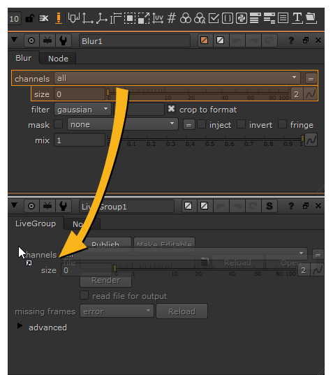 LiveGroupsは、コントロールを公開するためのギズモと同じメソッドをサポートしますPropertiesパネル。LiveGroup内のネストされたノードのコントロールを公開することも、独自のコントロールを追加することもできます。