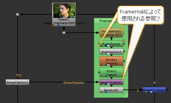 | 3. | 修正を含むRotoPaintノードの前にFrameHoldノードを追加します。 |