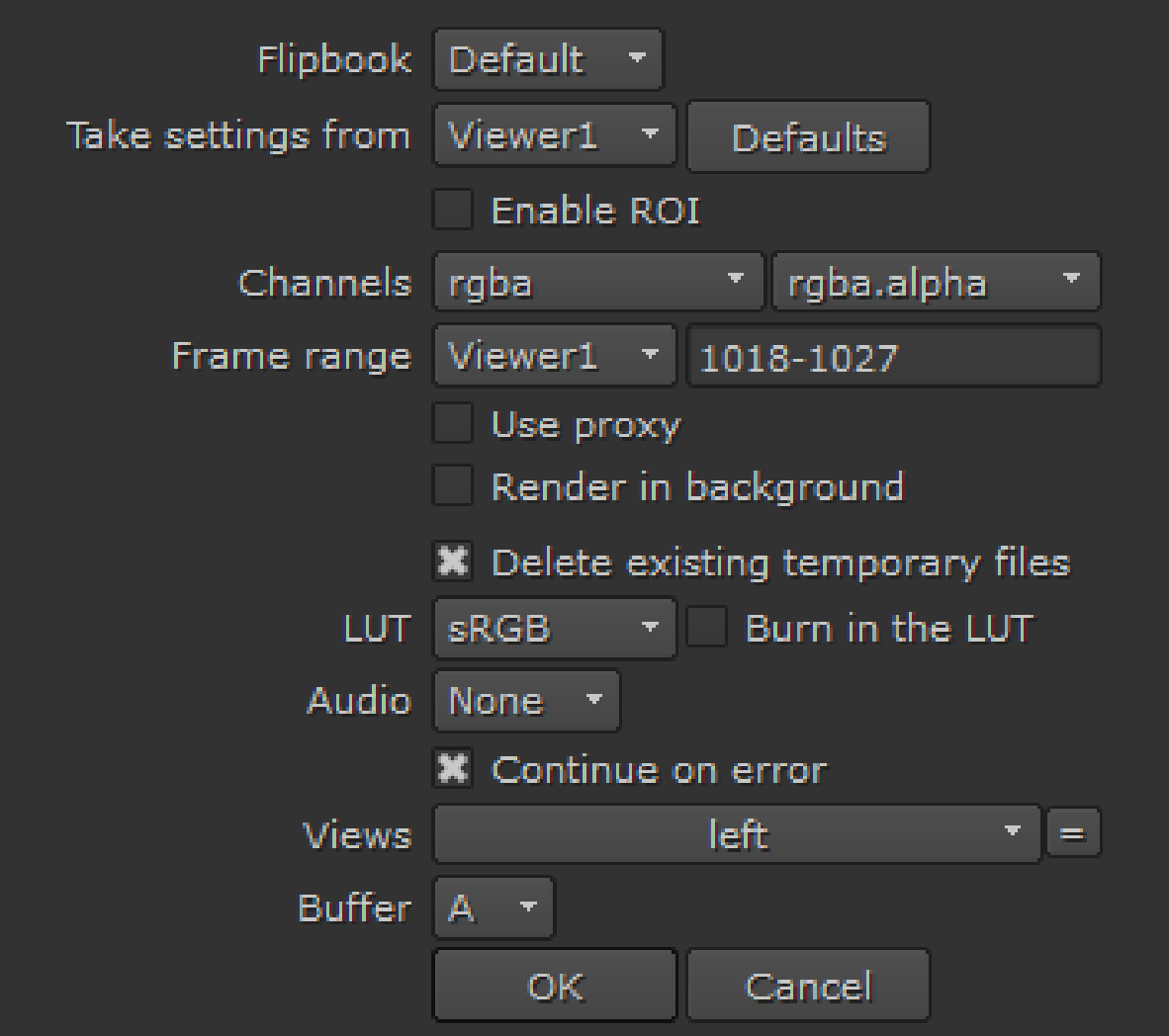| 3. | ダイアログで設定が正しいことを確認します。ダイアログの設定は、非ステレオシーケンスをフリップブックするときの設定とほとんど同じです。これらの設定の詳細については、 フリップブッキングシーケンス。 |