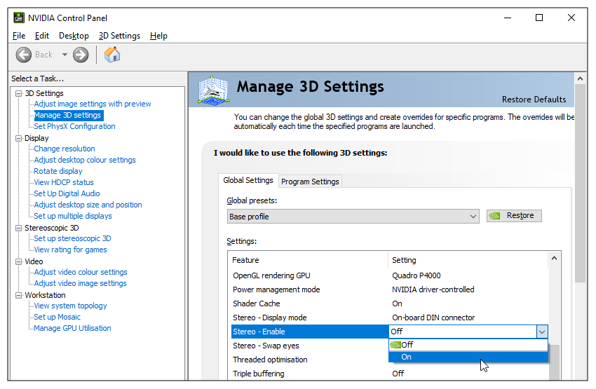 | 2. | 案内する3D Settings >Manage 3D Settings > Stereo - Enable。 |