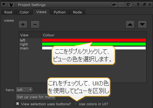 チェックするとUse colors in UI?、これらの色は、ノードグラフ接続、ノードの分割ビューインジケーター、ビューアーとShuffleViewsノードコントロールで使用され、ビューの区別を容易にします。