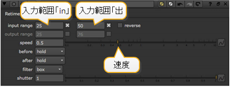 に係数を入力しますspeedパラメータとNukeを計算するoutput rangeあなたのために。1より大きい値は、再生速度を上げます。値が1未満の場合、再生速度が低下します。