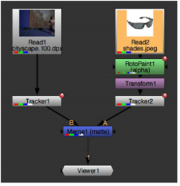 Nuke一致したい映像に追跡された動きを適用します。Tracker2がTracker1のコピーである単純なスクリプトは次のように表示されます。