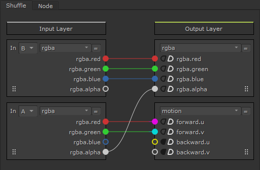 | 2. | シャッフルノードを使用して、VectorBlurがモーションベクトルファイル(ノード入力A)およびカラーイメージファイル(ノード入力B)から読み取るチャネルを選択します。この場合、モーションベクトルファイルの赤と緑のチャンネルをモーションのuとvのチャンネルとして使用し、そのアルファチャンネルをアルファチャンネルとして使用します。一方、画像ファイルはメインカラー画像の赤、緑、青のチャンネルを出力します。 |