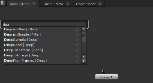 入力するTabメニューは選択を絞り込みます。たとえば、文字列を入力するdeaで始まるすべてのエントリを表示しますdea。この場合、開始するノードがないことがわかりますdea、 そうNuke代わりにノードの始まりを探しますdeとa名前に。