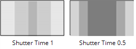 リタイミングシーケンスの同等のシャッター時間を設定します。たとえば、0.5のシャッター時間は180度のメカニカルシャッターに相当するため、24フレーム/秒では、露出時間は1/48秒になります。 画面を横切って左右に移動する灰色の長方形を想像してください。以下の図は、 Shutter Timeリタイミングされた長方形に影響します。