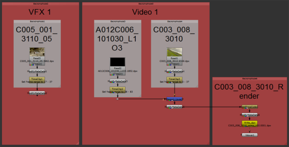 作成するときNuke異なるトラックの複数のショットでコンプすると、同じトラックのノードツリーは接続されますが、デフォルトでは異なるトラックのノードツリーは接続されません(以下を参照)。Create Comp Special設定を使用して、それらを接続することを選択できます。見るコンプスペシャルを作成詳細については。