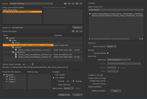 注意: カスタムショットプリセットを使用できますが、 Nuke Project FileそしてNuke Write Node選択に有効なコンテンツプリセット。見るローカルプリセットとプロジェクトプリセットの使用、 Nukeプロジェクトファイルの設定 、そしてNukeノード設定の書き込み詳細については。