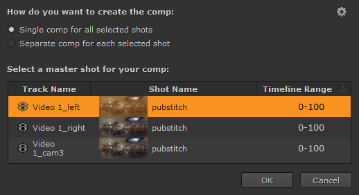 | 3. | コンプを作成するために複数のトラックごとのビューを選択した場合、すべてのビューを含む単一のコンプまたはビューごとに個別のコンプを作成し、マスターショットを選択できます。 |