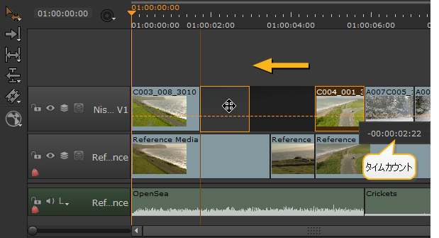 選択したショットをクリックして、タイムライン上の必要な位置にドラッグします。タイムカウントポップアップは、スナップツーエディット機能と組み合わせて、ショットを正確に再配置するのに役立ちます。
