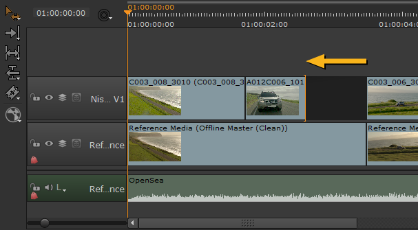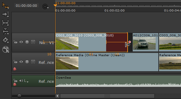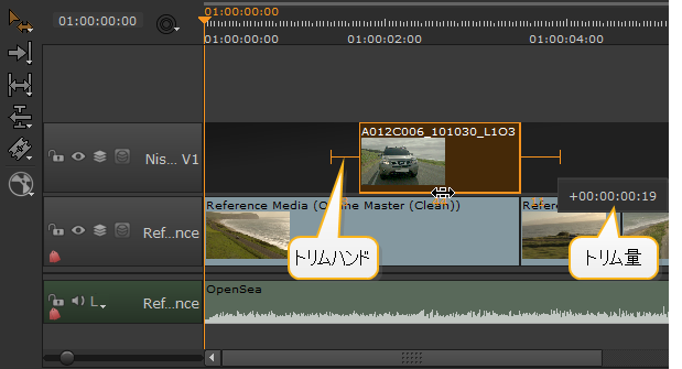 注意: ナッジキーを使用して、タイムライン上の他のショットを水平方向に上書きすることはできません。ただし、垂直ナッジ(Alt+,そしてAlt+.)他のトラックを上書きします。