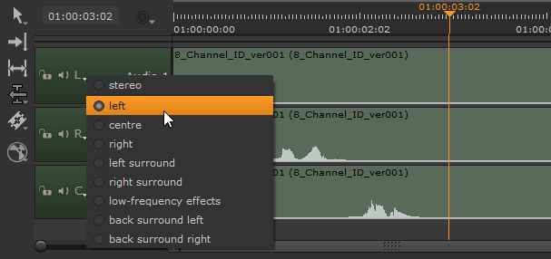 ショットのオーディオ出力は、クリップまたはショットの要件に応じて、8チャンネル間で切り替えることができます:左、中央、右、左サラウンド、右サラウンド、低周波エフェクト、バックサラウンド左、バックサラウンド右。ドロップダウンをクリックして、出力を切り替えます: