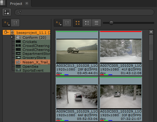クリップがローカライズされると、黄色のプログレスバーがサムネイルに表示されます。完全にキャッシュされたクリップは、サムネイルの上部に緑色のバーでマークされ、古いクリップは赤色でマークされます。