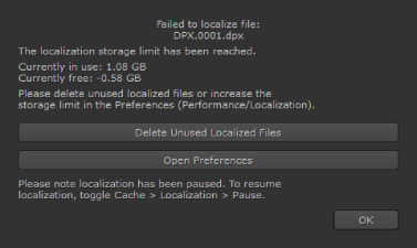 大量のファイルをローカライズすると、そのままにしておくとローカリゼーションキャッシュがすぐにいっぱいになる可能性があります。 limit to (GB)デフォルトは10 GBです。キャッシュのスペースがなくなると、 Failed to Localize Fileダイアログが表示され、ローカライズが一時停止します。