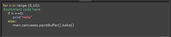 | 3. | Mari入力ペインで構文強調表示スキームを利用しているため、コードを一目で簡単に識別できます。赤のテキストは文字列を表し、濃い青はコメントを表し、さまざまなPythonキーワードは黄色、マゼンタ、および青で表されます。 |