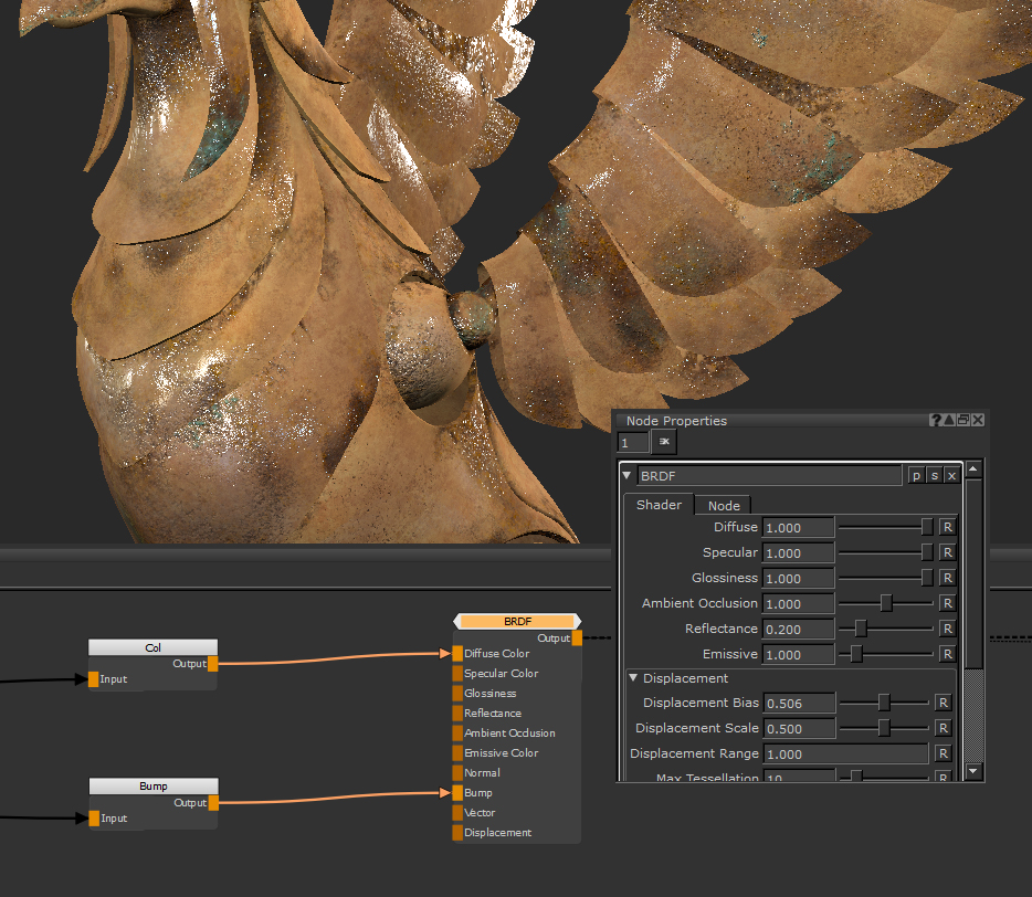 これで、フラットカラーだけでなく、スペキュラとシャドウを使用してオブジェクトの視覚化を開始できます。そこから、テクスチャーをシェーダーに組み込んだ他のチャネル(バンプマップなど)をBump入力。