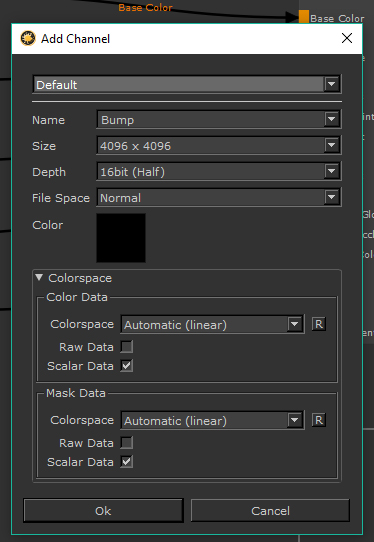 最初にChannelノードを追加する必要があります。これが完了すると、新しいチャネルのプロパティを要求するダイアログがポップアップ表示されます。チャンネルを選択するときは、設定がプロジェクトに対して正しいことを確認する必要があります。これはバンプチャネルになるため、 Depth 16ビットに変更されました。