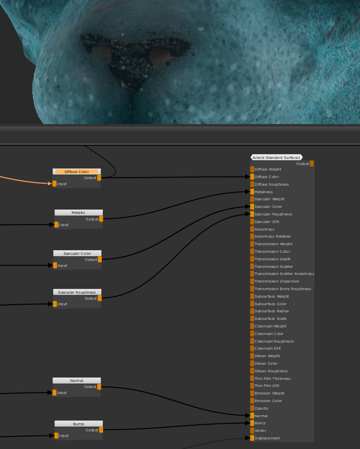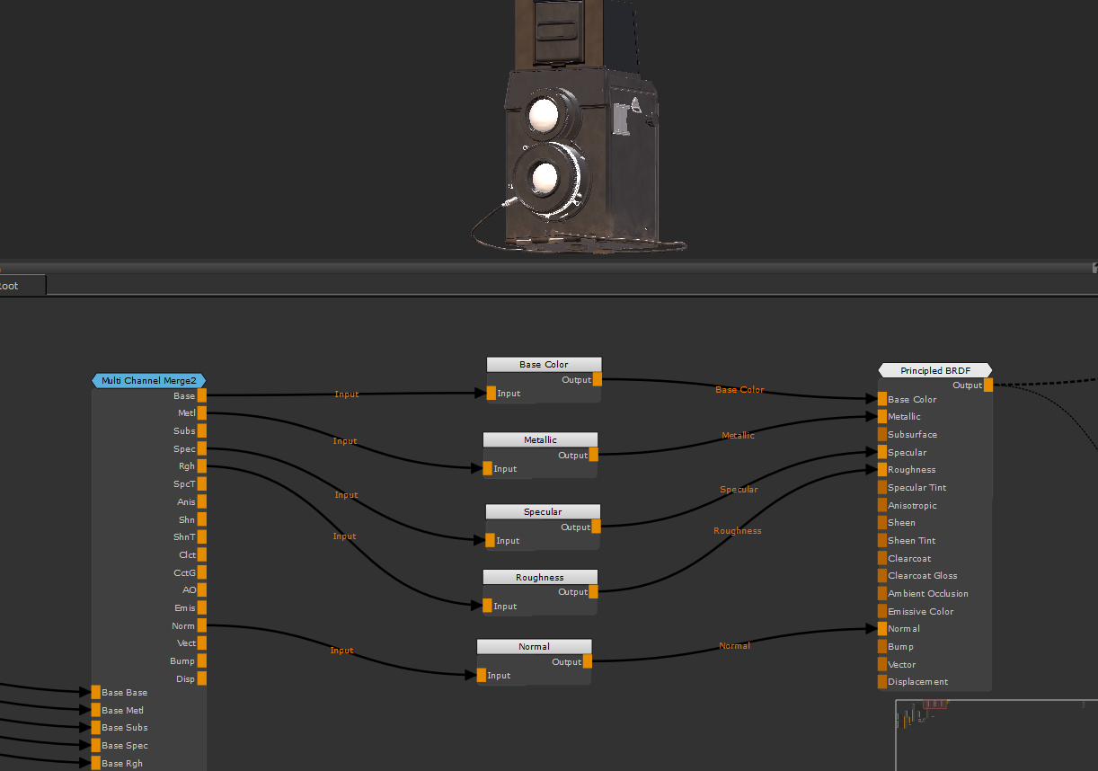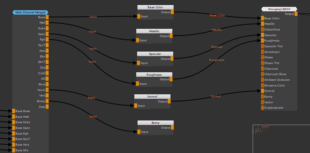 この例では、最終的なマルチチャネルがありますMergeエクスポート可能な複数のテクスチャチャネルを出力しているノード。ただし、レンダラーがすべてを必要とするわけではありません。それらのほとんどはすでに接続されていますChannelノードですが、バンプマップ用のチャネルをまだ設定していません。ビューポートでは、表示しているシェーダーも非常にフラットに見えているため、バンプを接続するのに最適です。